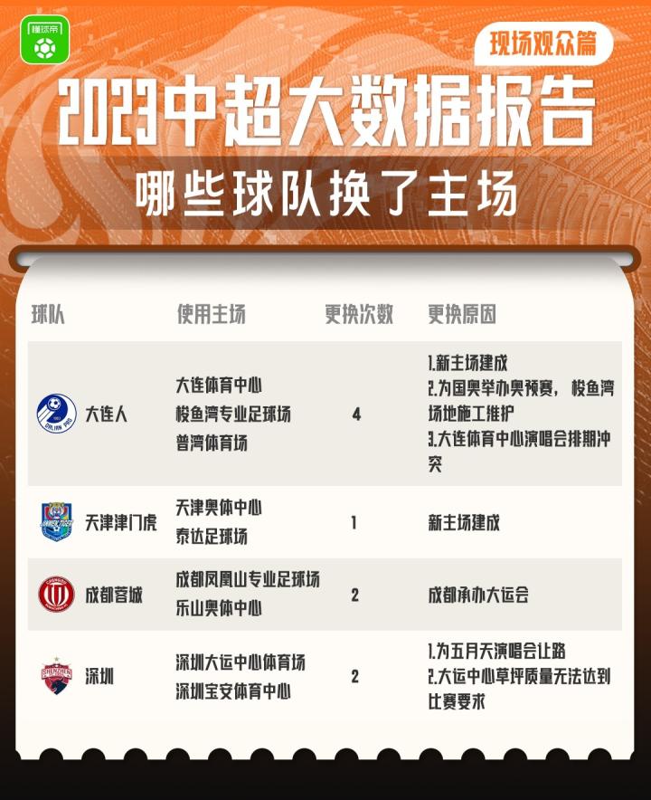 而整体来看,本赛季中超共有4支球队更换过主场,更换原因主要包括新主场建成、现有主场需承办某些赛事或活动、现有主场需进行维护等。