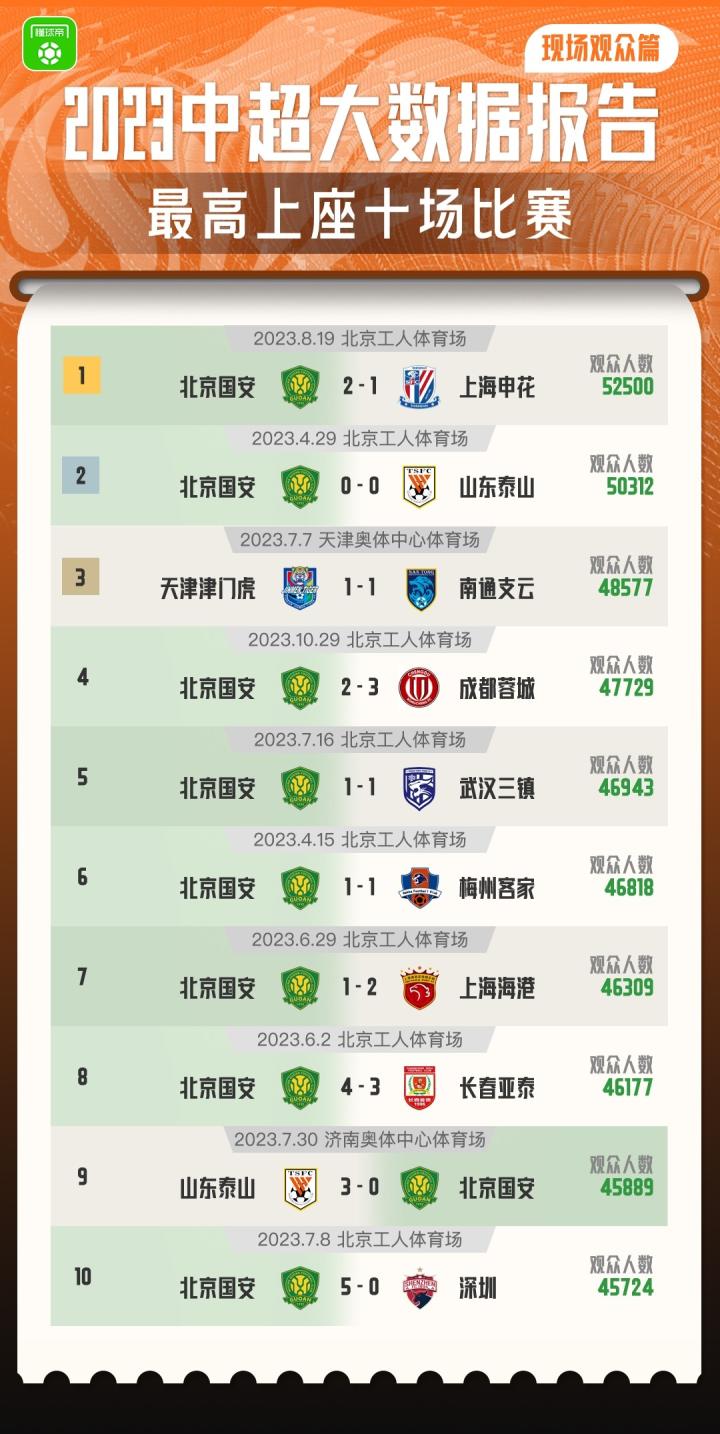 其中,第23轮北京国安vs上海申花上座人数达到52500人,创造今年中超单场比赛上座人数纪录。此外,另一场上座人数超过5万的比赛同样是在新工体进行。