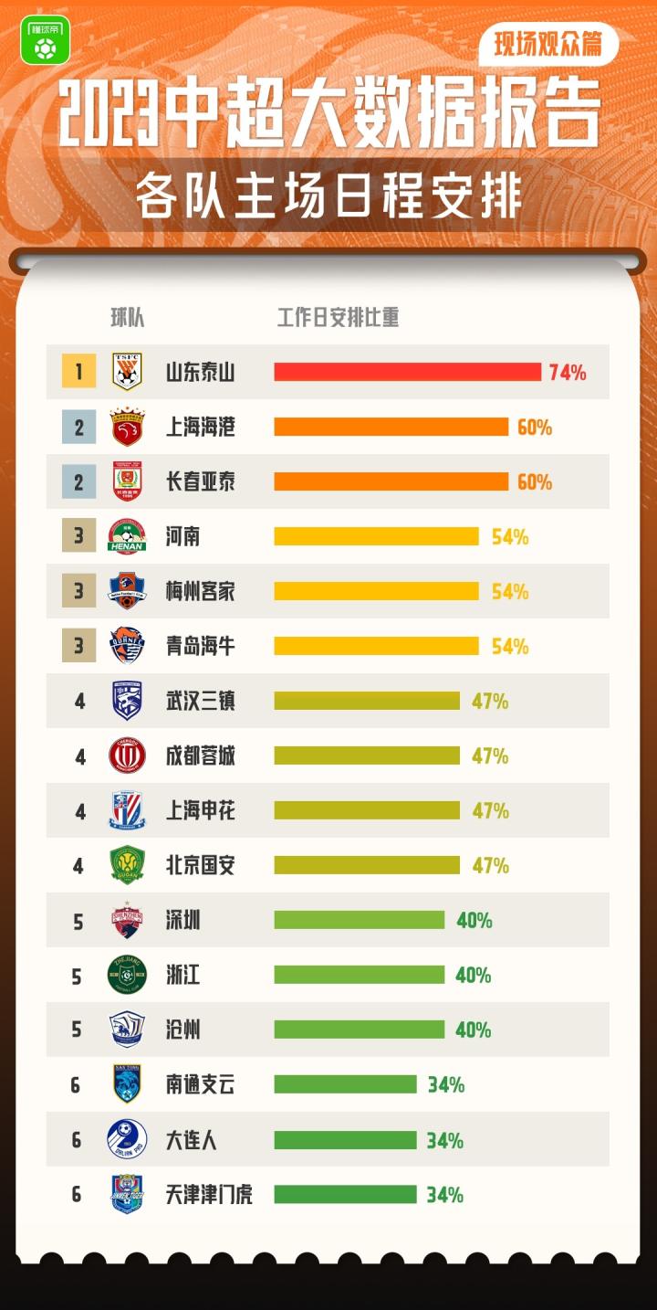 主场比赛被安排在工作日的占比超过50%的球队共有6支,其中最高的是山东泰山,他们的主场济南奥体中心今年15场中超比赛有11场被安排在了工作日,只有4场被安排在了周末和节假日。