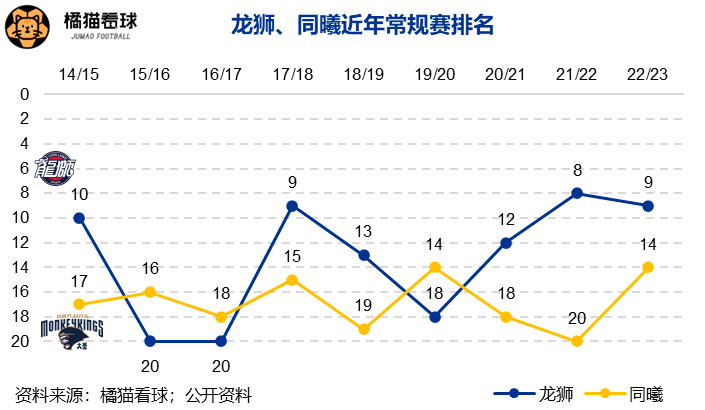 从战绩上看,龙狮和同曦基本都排在CBA中下游,可谓平民球队的典型,没有太多耀眼的荣誉加身,也没有大笔的投资,正适合作为研究对象。