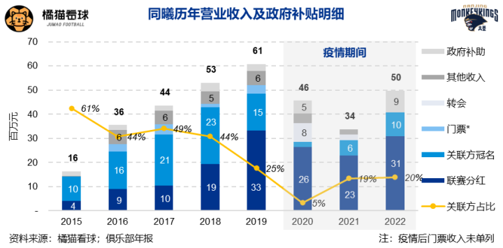 整体而言,联赛分红和冠名费是龙狮和同曦最重要的收入来源,政府补助规模稍小但胜在稳定,转会等其他收入要看“天”。两队的盈利都少不了关联方的鼎力支持。