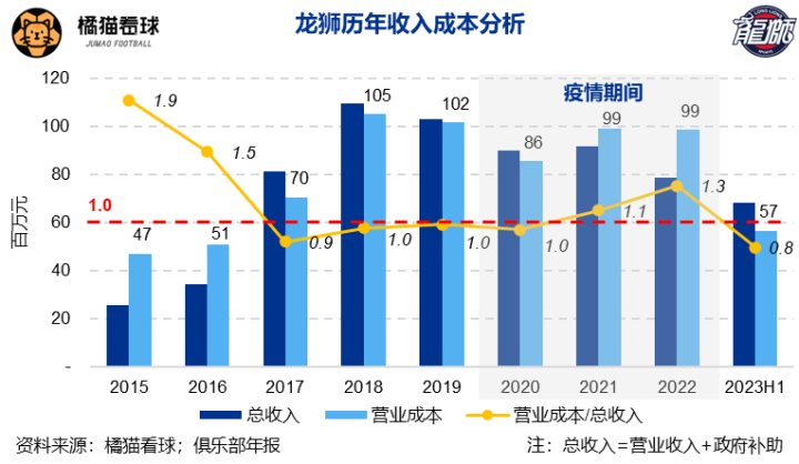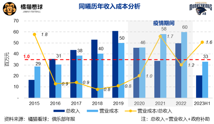 两队的营业成本,即球员、教练的工资和转会费支出,基本和收入规模呈正比。龙狮近几年的营业成本在1亿上下,同曦则在6000万左右。即便是亏损较大的年份,两队营业成本与总收入的比值也没有超过2倍,超支规模相对可控。