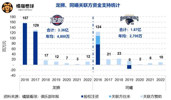 2016年至2022年7年间,龙狮和同曦的累计亏损额仅为4600万和100万,根据财报信息挖掘,同期两家俱乐部的股东和关联方以增资、往来款和赞助的形式分别投入3.36亿和1.87亿,年均投资强度分别为4800万和2700万。