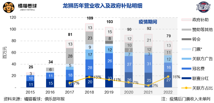 同曦的关联方冠名,与龙狮的关联方广告,在实质上可以认为是同一类收入,即俱乐部所有者通过购买广告的方式,给球队投入的运营费用。龙狮也一直有来自关联方能兴控股等公司的广告收入,与关联方收入占比高达三成的同曦不同,龙狮的关联方收入更像是调节报表盈亏的补充性收入,在收入中的占比保持在16%以下。