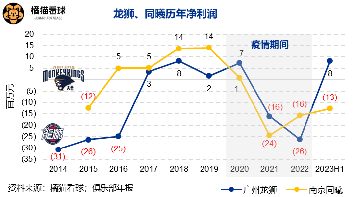 下图展示了龙狮和同曦2014年到2023年第一季度的净利润情况,其中黑色数字为盈利,红色数字为亏损。两家俱乐部2017年前后脚登陆新三板,利润走势基本趋同,挂牌后的前四年,即2017年到2020年,均保持小幅盈利;之后受到疫情影响转为亏损,2021年和2022年,龙狮分别亏损1600万、2600万,同曦则是2400万和1600万。与新三板挂牌6年巨亏76亿的广州足球俱乐部相比,这个亏损额简直可以忽略不计。可以预料,假如没有疫情的打击,CBA球队完全可以做到持续盈利。