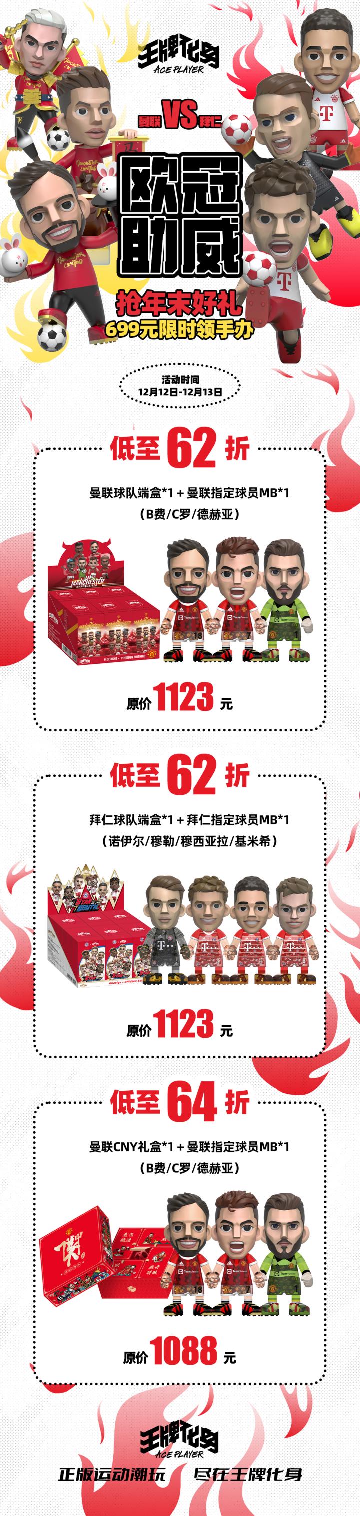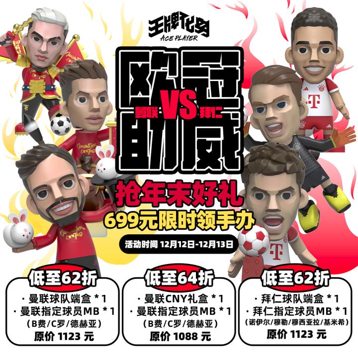 王牌化身获得曼联、拜仁官方授权,推出球队和球员官方盲盒手办。王牌化身懂球帝“助威欧冠助威曼联vs拜仁,抢年末好礼,699元限时领手办”正在进行中,限时福利,疯狂折扣,快来领取吧。