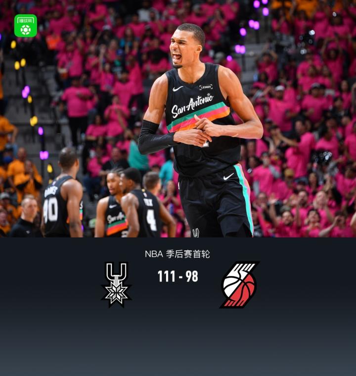 北京时间4月20日NBA 季后赛首轮G1,圣安东尼奥马刺对阵波特兰开拓者。上半场马刺依靠文班亚马21分带队建立两位数领先,半场马刺59-49开拓者,末节马刺一度领先21分,随后开拓者反扑追至11分,但没能继续追分,比赛最后52.8秒杨瀚森替补登场并没有表现机会,最终马刺111-98开拓者,大比分1-0领先。