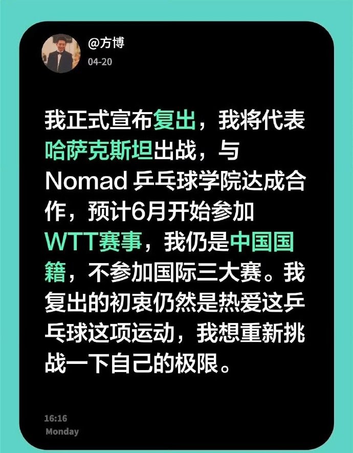 前国乒选手方博将复出参加WTT赛事,会籍变更为哈萨克斯坦