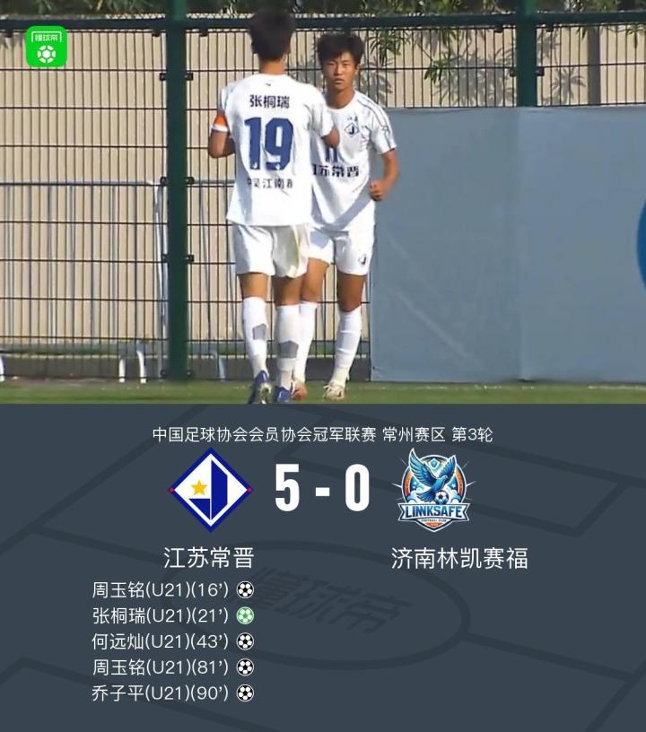 北京时间4月24日中国足球协会会员协会冠军联赛 常州赛区 第3轮,江苏常晋主场对阵济南林凯赛福。上半场周玉铭与队友配合后破门,随后许亚辉造点,张桐瑞主罚命中,之后济南林凯赛福后防解围失误,何远灿破门。下半场周玉铭内切折射破门完成双响,比赛尾声周玉铭传球,乔子平远射破门。最终江苏常晋5-0济南林凯赛福进入晋级组。