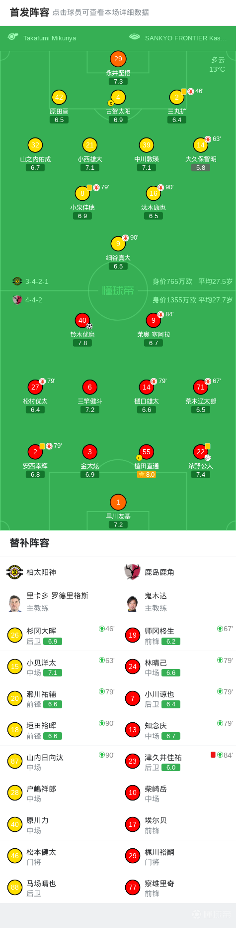 第45+1分钟,浓野公人连续突破,助攻铃木优磨破门,鹿岛鹿角1-0柏太阳神
