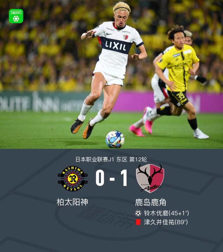 北京时间4月24日日本职业联赛J1 东区 第12轮,柏太阳神主场对阵鹿岛鹿角。鹿岛鹿角铃木优磨破门。最终比分柏太阳神 0-1 鹿岛鹿角。