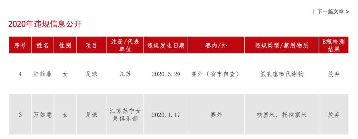 在国家体育总局反兴奋剂中心官网公布的2020年第一期兴奋剂检测违规信息名单中,江苏女足球员陆菲菲以及万如意出现在了名单内。