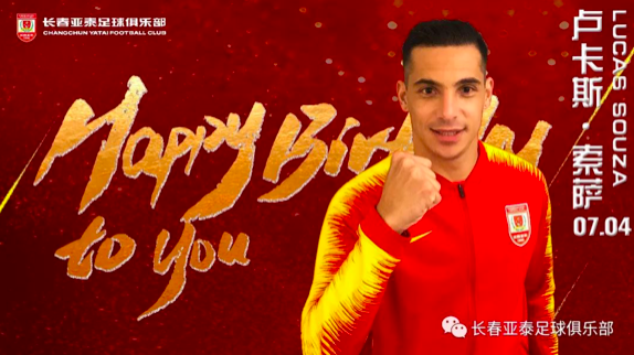7月4日是长春亚泰外援卢卡斯·索萨30岁的生日。这里,俱乐部祝卢卡斯生日快乐,希望他在新赛季能为球队攻城拔寨。