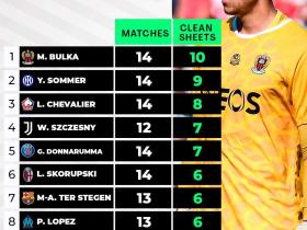 五大联赛门将零封场次排行榜1、尼斯门将布乌卡14...