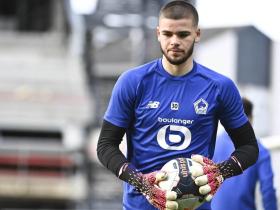 22岁的里尔门将舍瓦利耶在法甲对阵梅斯的比赛中扑...