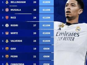 德转中场球员身价:贝林厄姆1.8亿欧领衔,穆西亚拉第二