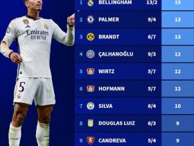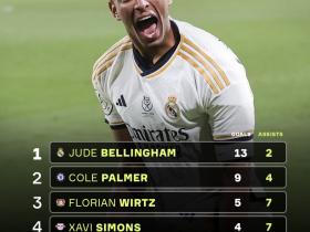 本赛季五大联赛参与进球最多的中场球员:贝林厄姆领衔