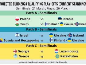 2024欧洲杯附加赛半决赛对阵如下(主队在前,前...
