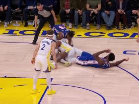 恩比德被扑球的库明加压到膝盖,痛得直摇手&已回更衣室!